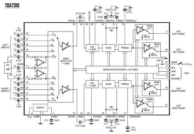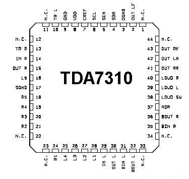 The TDA7310 is a volume, tone (bass and treble) and fader (front/rear) processor for high quality audio applications in car radio and Hi-Fi systems. Loudness and selectable input gain are provided. The control of all fuctions is accomplished by serial bus microprocessor interface. The AC signal setting is obtained by resistor networks and switches combined with operational amplifiers. Thanks to the used BIPOLAR/CMOS Tecnology, Low Distortion, Low Noise and DC stepping are obtained.