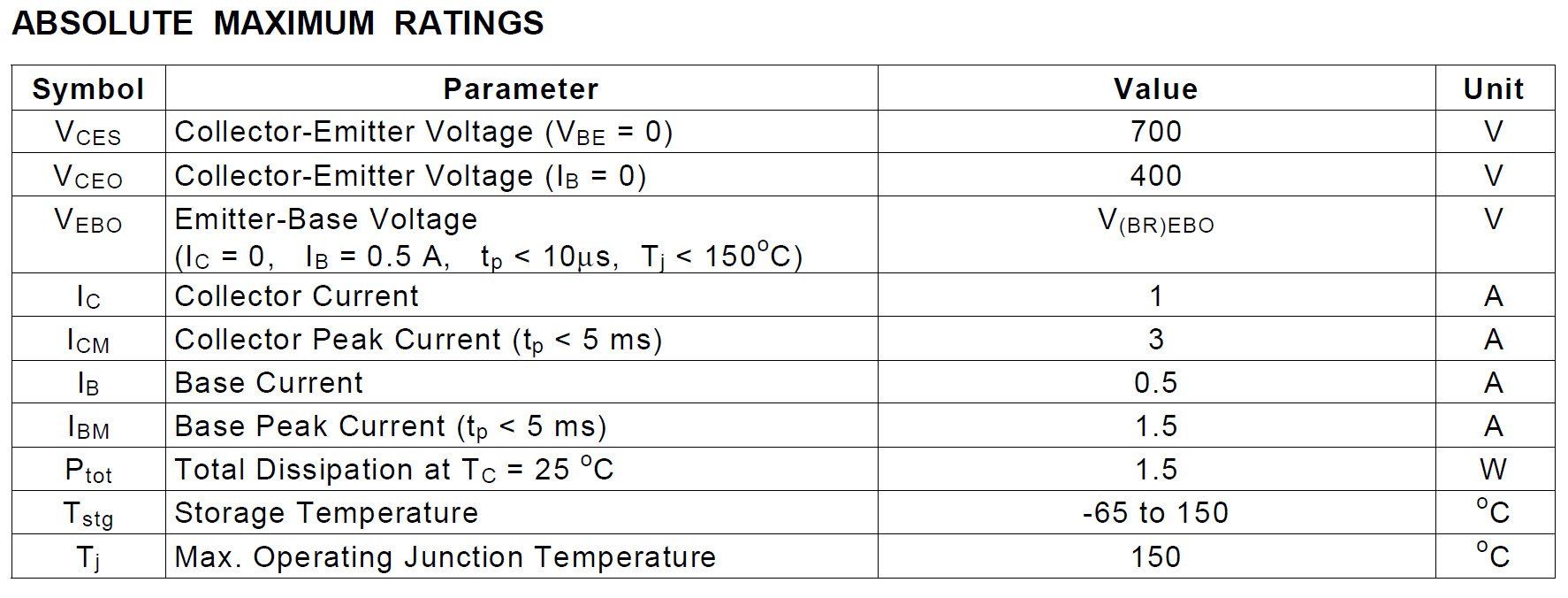 | VCBO 700V | VCEO 400V | Ic 1A | Ptot 1,5W |